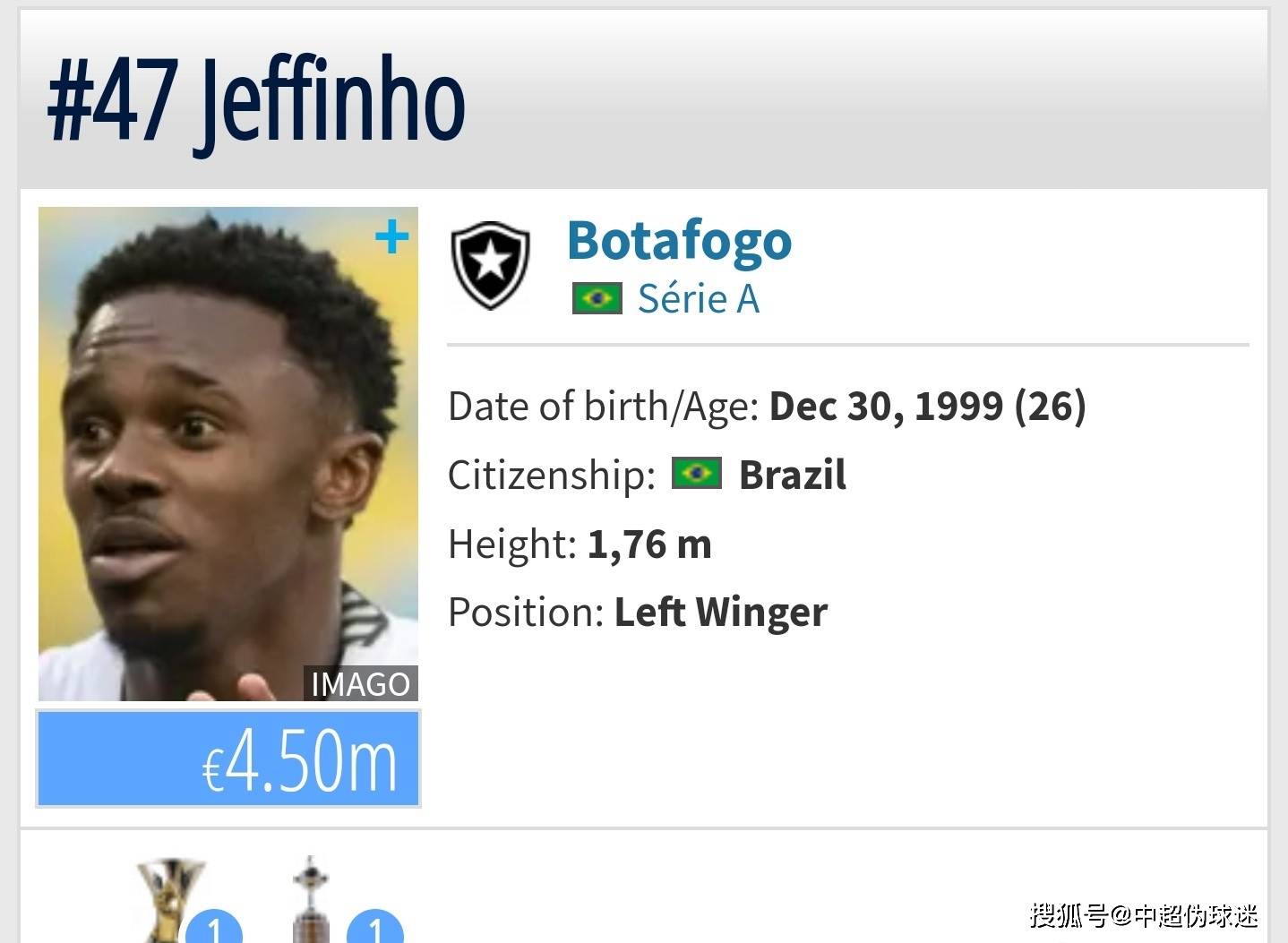 现年26岁的热菲尼奥德转身价达450万欧,场上司职左边锋,此前曾在法甲里昂队效力两个赛季,2024赛季加盟巴甲的博塔弗戈并效力至今。2025赛季,热菲尼奥代表博塔弗戈出场26场,攻进2球并送出4次助攻。