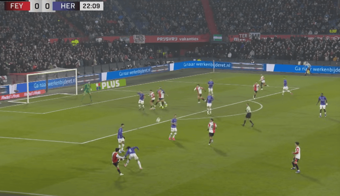 如果说这个球是黄仁范发起的,他并没有奉献助攻的话,那么后面的两个进球,黄仁范都直接完成了助攻!在双方1-1战平的情况下,第35分钟,黄仁范在前场犀利突破后,在禁区右侧送出一脚横传妙传,帮助队友博斯完成破门,费耶诺德半场2-1领先。