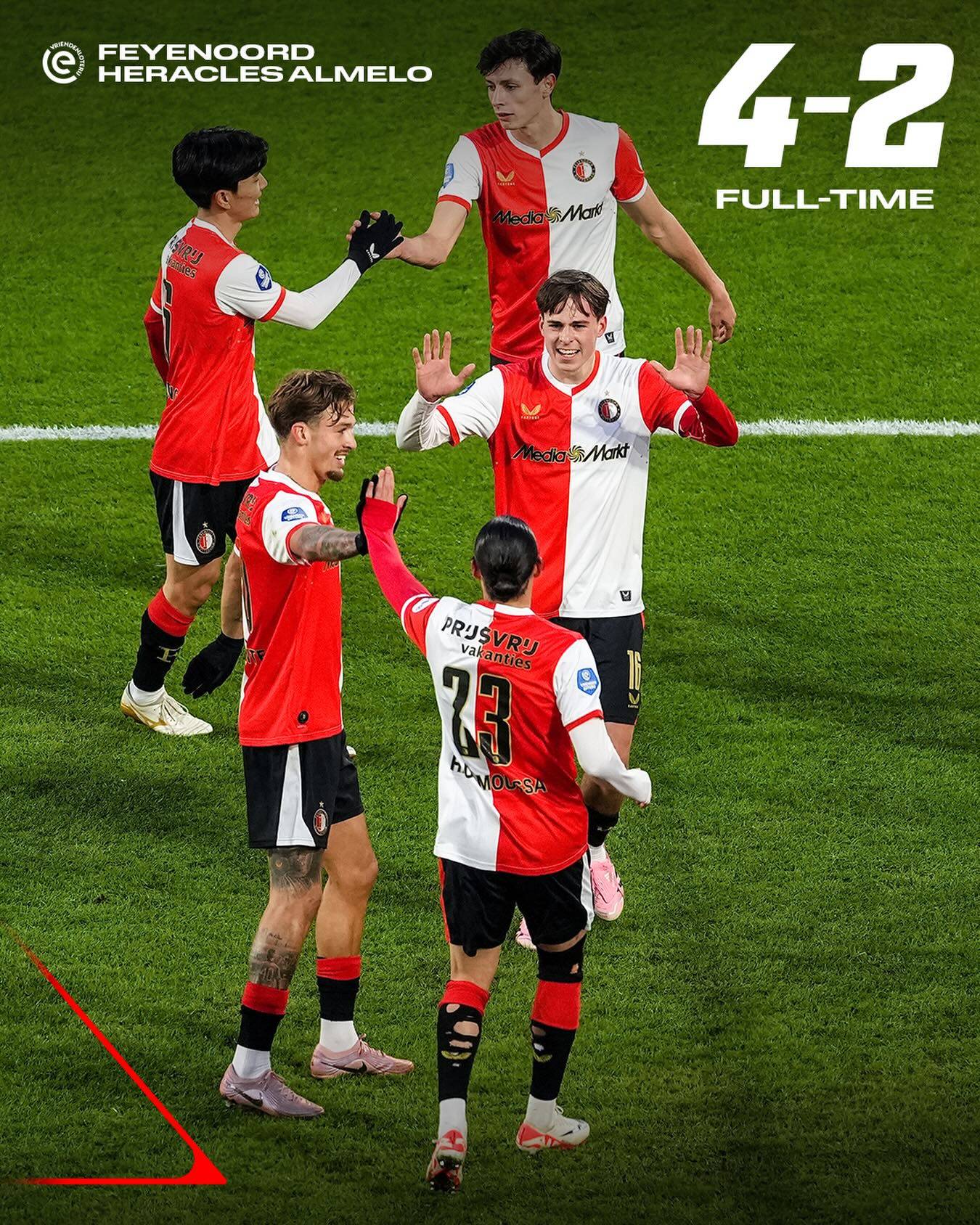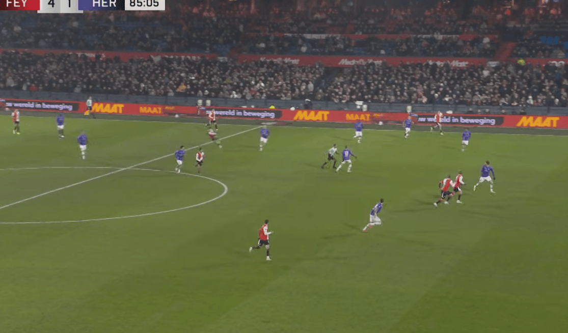 进入到下半场,双方陷入苦战,都获得了射门机会,第83分钟,穆萨在禁区内完成抽射破门,3-1!2分钟后,又是黄仁范站了出来,他在中场附近转身送出“手术刀”般长传,队友腾斯特心领神会接球后挑过对手门将破门,黄仁范以两个助攻闪耀全场。此后的比赛,虽然对手打入一球,但无力回天,最终费耶诺德4-2击败对手。凭借这场胜利,费耶诺德以39分重新夺回第二名。而黄仁范的赛季各项赛事记录,也变为了1球5助攻,健康的黄仁范,无可阻挡。